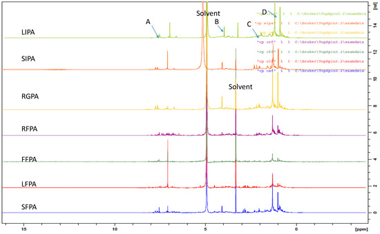 The advantage of NMR metabolomics is its ability to detect a wider range of metabolites compared to GC/MS and LC/MS. It is also highly reproducible and non-destructive [55,56]. NMR was used in this study to identify the variation in metabolites responsible for the activity and grouping in the multivariate analysis. The results of the one-dimensional proton NMR analysis of the extractable and non-extractable phenolics are presented in Figure 5 and Figure 6. The samples were selected for the NMR analysis based on their clustering in the AHC and PCA analysis. In the two statistical tools, free and ester bound phenolics were clustered in group 2 (or 2 and 3 in the case of AHC) while the glycosides and insoluble phenolics were clustered in group 1. All the free phenolics were selected to represent the cluster 2 (or 2 and 3, in the case of AHC) while LIPA, RGPA, and SIPA were selected to represent cluster 1. Multiplet signals (Figure 5) at aromatic region δH 7.7 and 7.5 ppm (A), δH 4.2 ppm (B), δH 1.7–1.27 ppm (C), and δH 0.92 ppm (D) are characteristics of phthalates, which are contaminants from the solvents used for the extraction [57]. The solvent peaks are indicated at δH 5 ppm and δH 3.2 ppm.