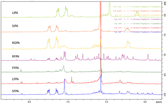 In the proton NMR spectra, δH 0.5–3.0 ppm are the aliphatic or organic, amino acid region while the chemical shift ranges δH 3.0–5.5 ppm and 5.5–10 ppm are predominantly the carbohydrate and aromatic regions, respectively [58,59]. Signals with chemical shifts characteristics of carbohydrates were not visible in any of the spectra. The result of the aromatic region of the extractable and non-extractable phenolics is presented in Figure 6.