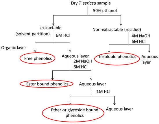 The flowchart indicating the extraction of free, ester, ether, and insoluble-bound phenolics.