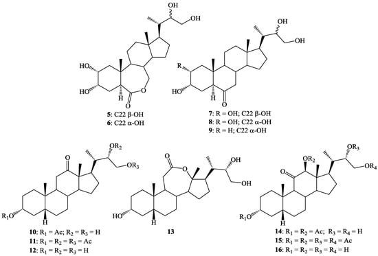 - Schneider, J.A.; Yoshihara, K.; Nakanishi, K.; Kato, N. Typhasterol (2-deoxycastasterone)—A new plant-growth regulator from cat-tail pollen. Tetrahedron Lett. 1983, 24, 3859–3860. [Google Scholar] [CrossRef]