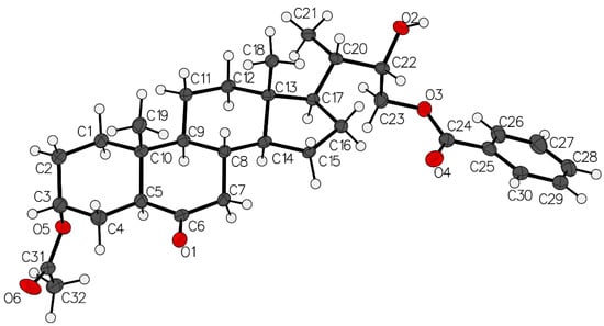 The absolute configuration S for C22 of compound 22 cannot be reliably determined using only the Flack’s parameter value of −0.2(3), calculated by using 1169 quotients of the type [(I+) − (I−)]/[(I+) + (I−)] [48]. Nevertheless, the analysis of Bayesian statistics of Bijovet pairs it is a much simpler and reliable method to determine the absolute configuration for molecules that contain atoms no heavier than oxygen [49]. The resulting values for the analysis of 2386 Bijovet pairs, Hooft’s parameter y: 0.0(2); P2(true): 1.000; P2(false): 1.743 × 10−6; P3(true): 0.973; P3(false): 1.695 × 10−6 and; P3(racemic twin): 0.027, have confirmed the absolute structure for compound 22. Additionally, considering that compound 22 was synthesized using enantiopure precursors, the configurations R, S, S, S, R, S, S, R and S have also been verified for atoms C3, C5, C8, C9, C10, C13, C14, C17 and C20, respectively.