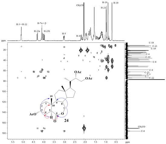 Inverse detection heteronuclear-correlated 2D 1H-13C HMBC contour plot, and main 2JHC (red) and 3JHC (blue) correlations observed for hydrogens H-5α and H-7 of compound 24 (7-oxalactone).
