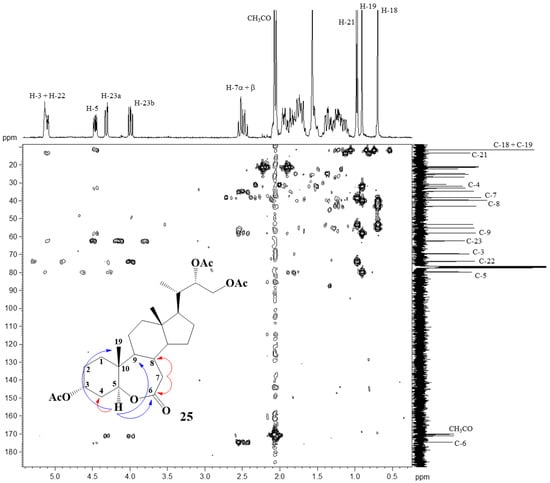 A similar analysis was performed to determine the structure of 6-oxalactone 25. Thus, in the 1H-NMR spectrum a signal at δH = 4.46 ppm was assigned to H-5α, and correlated by 2D 1H-13C HSQC with the signal at δC = 79.68 ppm (CH with impair multiplicity from DEPT-135 spectrum). Additionally, H-5α shows 2JHC correlation with signal at δC = 32.95 ppm that is assigned to carbon C-4; and 3JHC correlation with signals at δC = 11.59, 57.94 and 174.64 ppm, which are assigned to carbons CH3-19, C-9 and C-6, respectively (C=O, of lactone function, Table 2). On the other hand, the 1H-NMR signal at δH = 2.55–2.43 ppm, corresponding to H-7 (2H, m), shows 2JHC correlation with signals appearing at δC = 38.31 and 174.64 ppm, which were assigned to carbons C-8 and C-6, respectively (Table 2); and 3JHC correlation with signals at δC = 57.97 ppm, assigned to carbons C-9. These correlations are shown in the 2D HMBC spectrum in Figure 6.