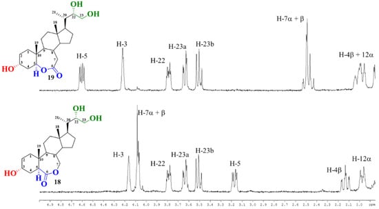 Similar analyses were performed to determine the structure of compounds 18 and 19. In Figure 7 are shown parts of 1H-NMR spectra of compounds 18 and 19 where the major differences in chemical shift of protons H-5 and H-7 are observed for both molecules. For example, H-5 in compound 18 (7-oxalactone) appears at higher field (δH = 3.17 ppm) than in compound 19 (6-oxalactone) (δH = 4.60 ppm) (Figure 7). Similarly, H-7α and β in compound 18 are observed at downfield (δH = 4.08–4.07, m, 2H), while in 6-oxalactone 19 these H-atoms are displaced to high field (δH = 2.53–2.43, m, 2H) (Figure 7).