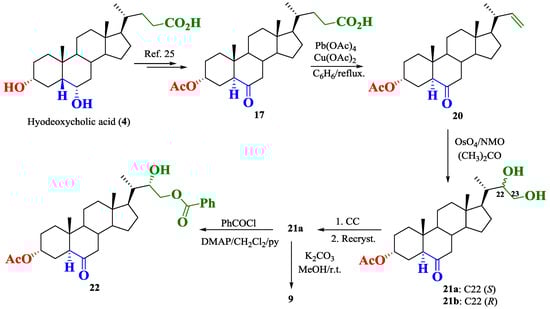 Dihydroxylation of alkene 20 with OsO4 produces an epimeric mixture of 21a and 21b in 72% yield (Scheme 1). This is an expected outcome for this reaction in steroidal nucleus with a terminal double bond at the C22−C23 position (24-nor-chol-22-ene), and the 22(S) alcohol is stereoselectively obtained [47]. Thus, epimeric mixtures have been obtained during the preparation of analogs 10, 11 and 12 (Figure 2) [15,16,17].