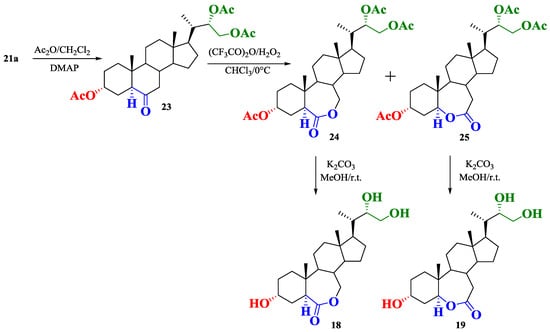 Baeyer-Villiger oxidation of 23 with CF3CO3H/CHCl3 system produces lactones 24 and 25 with 35% and 14% yields, respectively. Finally, deacetylation reaction of lactones 24 and 25 under mild conditions (K2CO3/MeOH, at room temperature) produced the new analogs of 2-deoxy-brassinosteroids 18 and 19 with 86% and 81% yields, respectively.