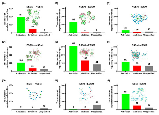 The regulatory relationships among neuroendocrine immunomodulation (NIM) signaling molecules belonging to different systems in the core molecular network. The x axis represents the three types of regulatory relationship (activation, inhibition, unspecified), and the y axis represents the number of regulatory relationships. The meaning of the network elements is the same as that shown in Figure 1. (A) The internal regulatory relationship of NSSM and its network form; (B) The regulatory relationship from NSSM to ESSM and its network form; (C) The regulatory relationship from NSSM to ISSM and its network form; (D) The regulatory relationship from ESSM to NSSM and its network form; (E) The internal regulatory relationship of ESSM and its network form; (F) The regulatory relationship from ESSM to ISSM and its network form; (G) The regulatory relationship from ISSM to NSSM and its network form; (H) The regulatory relationship from ISSM to ESSM and its network form; (I) The internal regulatory relationship of ISSM and its network form. Nervous system signaling molecules, NSSM; endocrine system signaling molecules, ESSM; immune system signaling molecules, ISSM.