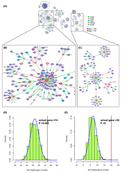 We took GSE63061 [34] in the GEO database as the gene expression profile of AD and screened differentially expressed genes (DEGs) (p < 0.05) through the GEO2R tool (Table S21). Based on the extended network of NIM signaling molecules, we extracted an AD-specific NIM subnetwork, including 778 nodes and 776 edges (Figure 4A). We also conducted a permutation test for this subnetwork as described in the first case study. The probability density curve (Figure 4D,E) showed that the number of AD-related genes was nearly 3 times higher than those obtained by random sampling, indicating that the AD-specific NIM subnetwork constructed by the NIM molecular network is reliable with a high sensitivity in detecting the disease targets.