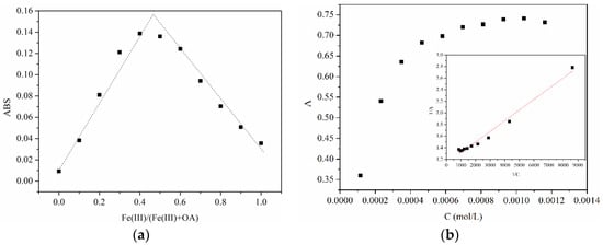 To confirm the formation of the Fe(III)-OA complex, absorbance of the Fe(III)-OA mixture solution at different Fe(III)/(Fe(III) + OA) ratios was measured in Figure 1a. The phenomenon followed an increasing but then decreasing pattern with a maximum value appearing at a Fe(III)/(Fe(III) + OA) ratio of around 0.5. This result reveals the existence of a 1:1 ligand-metal complex, which is similar to the previously reported Fe(III)-catechin complex [14].