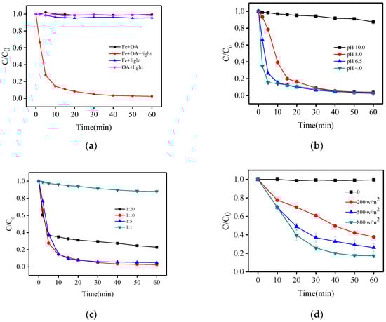 Photodegradation of bisphenol A (BPA), control experiments (a) and effect of initial pH (b), Fe(III)/OA ratio (c) and solar intensity (under sunlight) (d) on BPA degradation. [Fe (III)] = 116 μmol·L−1, [BPA] = 10 μmol·L−1, [OA] = 116 − 2320 μmol·L−1.