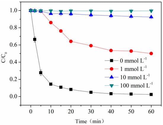 In the photo-Fe(III)-ligand process, reactive radicals including O2•−/HO2• and HO• were always produced through an electron transfer from ligand to the central metal (LMCT) in the presence of oxygen [27,28]. For the purpose of identifying HO• in the photo-Fe(III)-OA process, 2-propanol at various concentrations was introduced, because 2-propanol is an effective scavenger for HO• (k2-propanol,HO• =1.9 × 109 M−1 s−1) [29]. Figure 3 shows that when 2-propanol concentration increased from 0 to 100 mmol·L−1 at pH 6.5, the removal efficiency of BPA was substantially reduced by 99.8%, indicating a marked inhibition effect of 2-propanol. The result implied that HO• was produced in the photo-Fe(III)-OA process and subsequently contributed to BPA degradation. Moreover, owing to the fact that only 90.2% of BPA was degraded with an addition of 10 mmol·L−1 2-propanol, HO• was proposed to play a vital role for BPA photo-oxidation.
