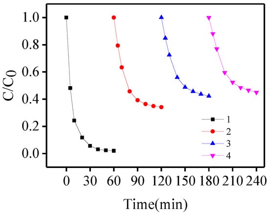 In our study, four runs were conducted to investigate BPA photo-oxidation. Initially, the degradation was performed at pH 6.5 with 116 μmol/L Fe(III) and 580 μmol/L oxalacetic acid. After 60, 120, and 180 min, 580 μmol/L catechin was added to the solution. As shown in Figure 4, the degradation rate of BPA in the second run decreased by 65.9% compared with the first run, and slowly decreased in subsequent runs. This can be attributed to the accumulation of intermediates produced in the former run. Such intermediates may compete with •OH for reaction with BPA in the solutions.