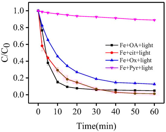 As shown in Figure 5, at a Fe(III)/ligand ratio of 1:5, the removal efficiencies of BPA reached 95.2%, 87.3%, 11.0%, and 98.8% for OA, Ox, Pyr, and Cit, respectively. The results established that the Fe(III)-OA complex had a high efficiency of BPA oxidation under the identical conditions, which may be related to the reaction mechanism in photo-Fe(III)-carboxylate system. In general, the ferric-carboxylate complex-based photo-Fenton-like processes always underwent a series of chain reactions [30,31], among which the reaction between Fe(II)-ligand and H2O2 was the critical process since the produced HO• from such reaction was primarily responsible for the degradation of substrate. The different photochemical activity of the Fe(III)-carboxylate system could be explained as follows: (i) more hydroxyl groups in the structure of OA, Ox, and Cit; (ii) the asymmetric and unstable structure of OA and Cit may lead to the easier formation of the Fe(III)-ligand complex and subsequently generate more HO•. The negligible removal of BPA with Fe(III)-Pyr system was also attributed to ferric precipitation in the high pH range (pH ≥ 6.0) due to its weak coordination ability [32]. As a result, OA can be regarded as an efficient alternative ligand to induce a ferric-carboxylate complex-based photo-Fenton-like process.