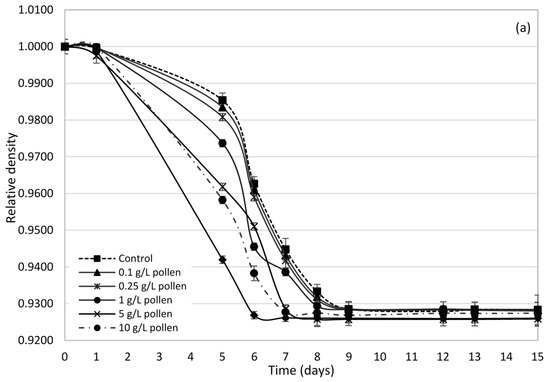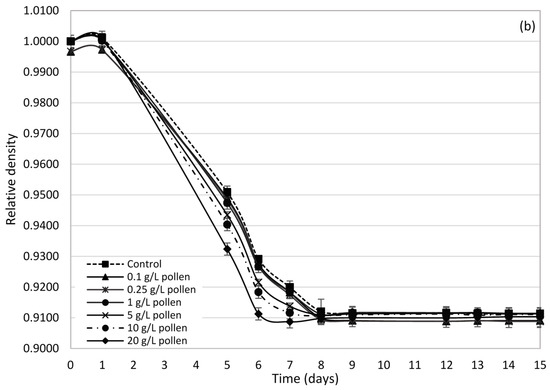 Relative density evolution in Palomino fino (a) and Riesling (b) grape musts during alcoholic fermentation with the addition of different bee pollen doses.