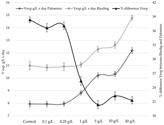 Figure 1a,b represent the relative density evolution during the alcoholic fermentation processes of Palomino fino and Riesling grape musts, respectively, with different doses of pollen and the control. Generally, except for 20 g/L dose, density slopes fall and are more pronounced and similar to each other in Riesling (Figure 1b) than in the Palomino (Figure 1a). Figure 2 shows that speed during the exponential phase of growth (Vexp) in Riesling musts is 28% higher than Palomino musts, although from 1 g/L dose these differences begin to be less pronounced. This behaviour cannot be attributed to YAN, since Palomino musts are superior for all YAN cases compared to Riesling must (Table 1 and Table 2). In fact, Riesling musts have no fermentation problems, even those with YAN values below 140 g/L (control and low doses). Some authors indicate that a YAN of 140 mg/L is the minimum necessary to complete and not have yeast growth problems during alcoholic fermentation (AF) [15,17]. Speed difference observed between varieties is due to the initial sugar concentration of musts, directly related to the grape maturation degree at the harvesting time [17]. While Riesling musts have a sugar concentration of 189 g/L, Palomino musts have a concentration of 165 g/L.