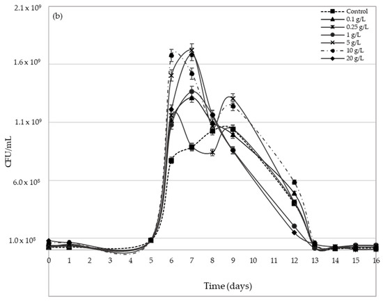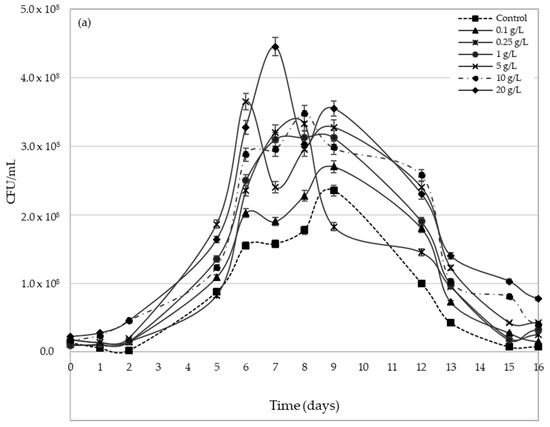 Figure 3 shows Saccharomyces cerevisiae viable yeasts evolution during the AF process. Both varieties show very different behaviours. In Palomino fino, lag phase lasts approximately 2 days, whereas Riesling showed of 5 days’ lag phase (Figure 3a,b) for all pollen doses and the control. Lag phase elongation in Riesling can be due mainly to its higher sugar concentration, which leads to a longer adaptation time for the yeast inoculum [35].