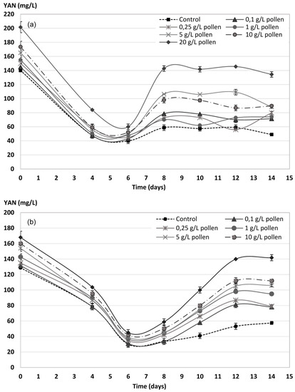Evolution of the yeast-assimilable nitrogen (YAN) by Saccharomyces cerevisiae yeasts during the AF process of Palomino fino (a) and Riesling (b) grape musts with bee pollen doses. The results are the mean ± SD of three repetitions.