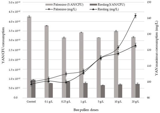 Maximum consumption of YAN against the maximum consumption of YAN/CFU during exponential growth phase of Palomino fino and Riesling grape musts with different bee pollen doses and control.