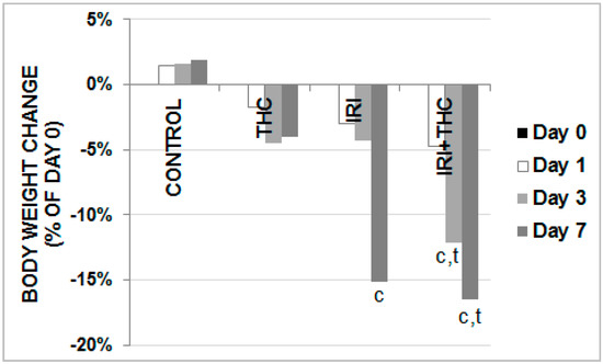 Changes in body weight gains in male Wistar rats after the 1-, 3-, and 7-day treatments with IRI, THC, their combination (IRI + THC), and in the respective controls. Values are expressed as mean ± SD (N = 5). Significantly different (p < 0.05) values were c: vs. control; t: vs. THC.
