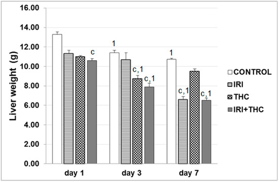 Liver weight changes in male Wistar rats after the 1-, 3-, and 7-day treatments with IRI, THC, their combination (IRI + THC), and in the respective controls. Values are expressed as mean ± SD (n = 5). Significantly different (p < 0.05; ANOVA, post hoc Tukey HSD test) values were c: vs. control; t: vs. THC; 1: vs. 1-day treatment.