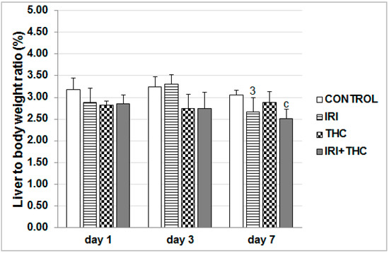 Liver to body weight ratio in male Wistar rats after the 1-, 3-, and 7-day treatments with IRI, THC, their combination (IRI + THC), and in the respective controls. Values are expressed as mean ± SD (n = 5). Significantly different (p < 0.05; ANOVA, post hoc Tukey HSD test) values were c: vs. control; 3: vs. 3-day treatment.