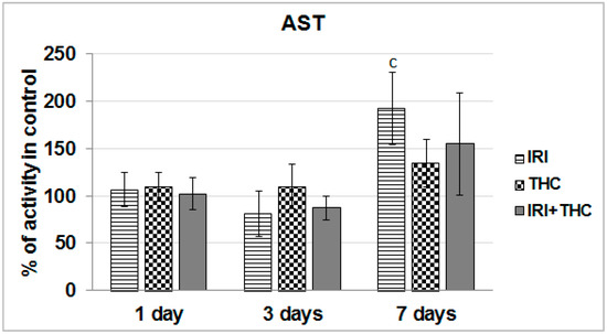 Effects of 1-, 3-, and 7-day treatments with irinotecan (IRI), Δ9-tetrahydrocannabinol (THC), and their combination (IRI + THC) on aspartate aminotransferase (AST) activity in the serum of male Wistar rats. Values are expressed as mean ± SD (n = 5). The significantly different (p < 0.05) value was c: vs. control rats.