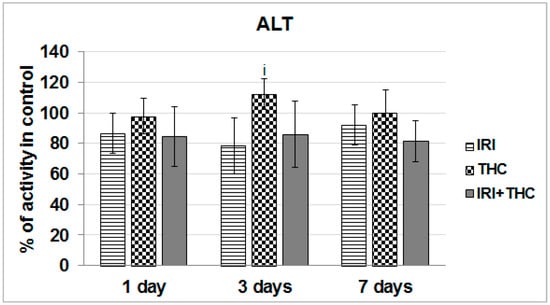 As shown in Figure 6, a statistically significant increase of ALT activity with respect to IRI-treated rats was observed only in THC-treated rats after the 3-day exposure.