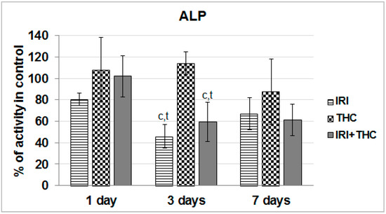 Exposure to single IRI caused a statistically significant decrease of serum ALP activity compared to control and THC-treated rats after the 3-day treatment (Figure 7).