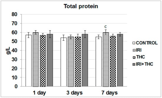 Effects of 1-, 3-, and 7-day treatments with irinotecan (IRI), Δ9-tetrahydrocannabinol (THC), and their combination (IRI + THC) on total protein in the serum of male Wistar rats. Values are expressed as mean ± SD (n = 5). The significantly different (p < 0.05) value was c: vs. control rats.