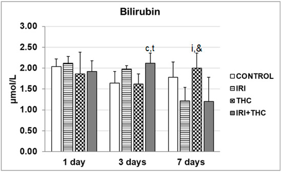 Serum bilirubin levels measured in male Wistar rats after the 1-, 3-, and 7-day treatments with irinotecan (IRI), Δ9-tetrahydrocannabinol (THC), their combination (IRI + THC), and in the respective controls. Values are expressed as mean ± SD (n = 5). The significantly different (p < 0.05) values were c: vs. control; i: vs. IRI-treated rats; t: vs. THC-treated rats; &: vs. rats treated with IRI and THC.