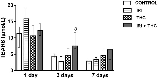 Changes in the thiobarbituric reactive substances (TBARS) concentration in the liver of rats after the 1-, 3-, and 7-day treatments with irinotecan (IRI), Δ9-tetrahydrocannabinol (THC), their combination (IRI + THC), and in the respective controls. The results are shown as median and interquartile range. The significantly increased values (p < 0.05) were (a) compared to rats treated with IRI.