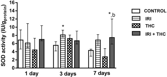 Changes in superoxide dismutase (SOD) activity in the liver of rats after the 1-, 3-, and 7-day treatments with irinotecan (IRI), Δ9-tetrahydrocannabinol (THC), their combination (IRI + THC), and in the respective controls. The results are shown as median and interquartile range. The significantly increased values (p < 0.05) were: (*) compared to control, (b) compared to rats treated with THC.