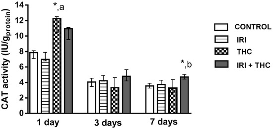 Changes in catalase (CAT) activity in the liver of rats after the 1-, 3-, and 7-day treatments with irinotecan (IRI), Δ9-tetrahydrocannabinol (THC), their combination (IRI + THC), and in the respective controls. The results are shown as median and interquartile range. The significantly increased values (p < 0.05) were (*) compared to control, (a) compared to rats treated with IRI, (b) compared to rats treated with THC.