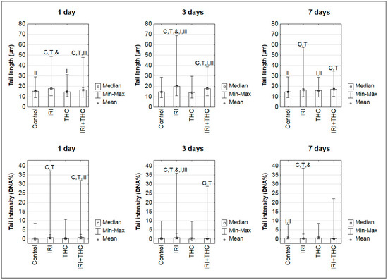The levels of primary DNA damage measured in hepatocytes of male Wistar rats using the alkaline comet assay after 1-, 3-, and 7-day treatments with irinotecan (IRI), Δ9-tetrahydrocannabinol (THC), their combination (IRI + THC), and in the respective controls. Legend: IRI was administered once, via an intraperitoneal injection at a dose of 100 mg/kg b.w.; THC was dissolved in sesame oil and administered daily per os at a dose of 7 mg/kg b.w.; control rats were given the same daily volume of sesame oil as the THC group. Data are reported as mean/median values, and ranges (Min.—minimum value; Max.—maximum value) of one thousand independent comet measurements per each experimental group (200 comets/rat were scored on duplicate slides). Significantly different (p < 0.05, ANOVA with post hoc Tukey HSD test) compared to C—control; T—THC; &—combination of IRI and THC; I—1-day treatment; II—3-day treatment; III—7-day treatment.