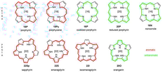 - Mack, J. Expanded, contracted, and isomeric porphyrins: Theoretical aspects. Chem. Rev. 2017, 117, 3444–3478. [Google Scholar] [CrossRef] [PubMed]