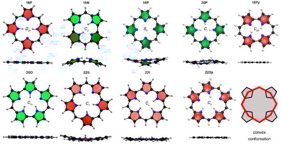 Hückel conformations computed for different porphyrinoids (top and side views). Red five-membered rings are linked to aromatic structures, whereas green ones to antiaromatic configurations. The symmetry point group together with a schematic representation of the convex conformer are also shown.
