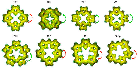 To further assess the (anti)aromaticity of the different Hückel porphyrinoids, the so-called AICD (anisotropy of the induced current density) plots were evaluated (Figure 3 and Figure S2) [56]. These plots display the density and the direction of the induced ring current when an external magnetic field is applied, usually perpendicularly to the π-system [57]. To distinguish between diatropic and paratropic ring currents, the current density vectors are plotted onto the AICD isosurface. From these plots, it is clear that aromatic species (18P, 18Py, 22S, 22Sp and 22I) display diatropic ring currents (clockwise current density vectors), while antiaromatic porphyrinoids (16P, 20P, 16N and 20O) display paratropic ring currents (anticlockwise current density vectors). Therefore, there is a strong relationship between the number of π-electrons on the annulene-type conjugation pathway and the aromaticity of our selected porphyrinoids.