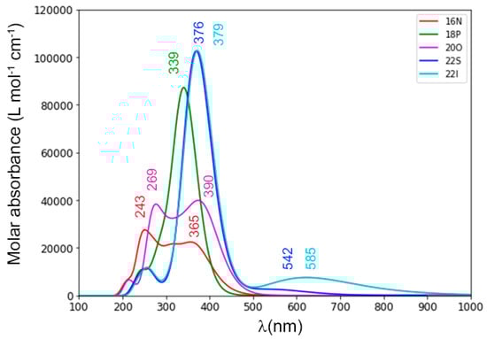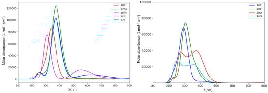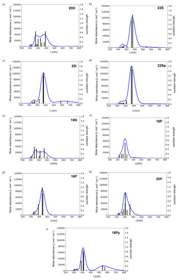 In the discussion of the photophysical properties, first the UV/vis spectra of 16N, 18P, 20O, 22S and 22I are discussed and the fingerprints of (anti)aromaticity of the absorption spectra are elucidated. Then, our findings are validated for the other set of Hückel porphyrinoids, namely 16P, 20P, 18Py and 22Sp. Table 2, Table 3, Table 4, Table 5 and Table 6 collect the characteristic properties of the first five electronic transitions and the most intense electronic transitions of porphyrinoids 16N, 18P, 20O, 22S and 22I. As can be seen in Figure 5, the absorption spectrum of aromatic macrocycles consists of intense and sharp peaks, while broader and weaker absorption bands are found in the absorption spectrum of antiaromatic systems. For the most intense absorption band, we observe the following order according to the molar extinction coefficient, which is related to the oscillator strength (fosc) of the transition: 22I ≥ 22S > 18P > 20O > 16N. As expected, the absorption bands become more intense for larger conjugation pathways in the selected porphyrinoids. Nevertheless, the effect of larger conjugation pathway is less important than the aromaticity or antiaromaticity of the π-conjugated system.