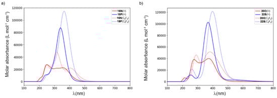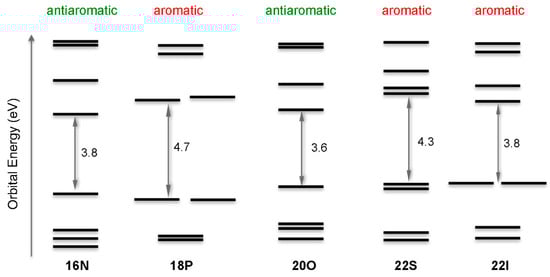 On the other hand, B and Q are not split and they are significantly weaker in antiaromatic species than in aromatic systems. This phenomenon is a consequence of the low symmetry of the molecule and the non-degeneracy of H, H−1 and L, L+1 orbitals, respectively (Figure 7) [60]. As indicated by their non-zero associated oscillator strength, the Q band of 20O and 16N is not fully forbidden. The most intense absorption bands correspond to high-energy electronic transitions in the B band. In Table 3, the fourth electronic transition of 16N (B band, fosc = 0.436) is only slightly weaker than the tenth electronic transition (high-energy electronic transition, fosc = 0.496). In 16N, the three most intense absorption bands are associated to the following electronic transitions involving large differences in orbital sequence: H→L+4 > H→L+2 > H−4→L. In the case of 20O, the B band and 12th electronic transition have nearly the same intensity (fosc = 0.65), as can be seen in Table 5 and Figure 6. However, the B band of 20O is associated to H−1→L+1 transition under z-polarization, while the 12th electronic transition corresponds to a H→L+2 transition, which is allowed under y polarization. The third main absorption band in 20O is associated to H−2→L transition.