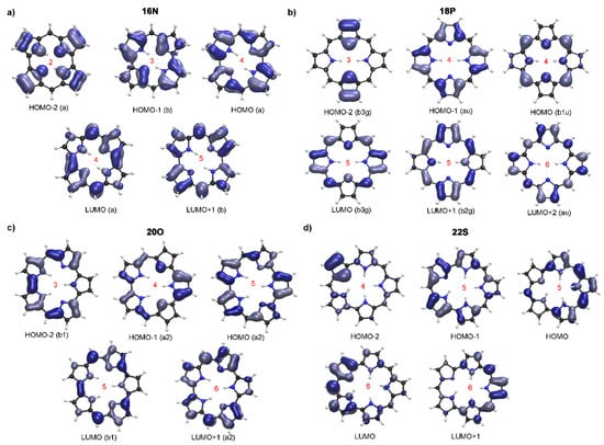 Molecular orbitals for aromatic and antiaromatic Hückel porphyrinoids: (a) (16)norcorrole, (b) (18)porphyrin, (c) (20)orangarin, (d) (22)smaragdyrin. The values in red indicate the number of nodal planes in each orbital.