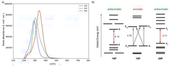 To assess the effect of the aromaticity on the photophysical spectra, we additionally investigate the changes in the UV-vis spectra of the archetypal (18)porphyrin upon oxidation and reduction of the macrocycle. The (16)porphyrin and (20)porphyrin are antiaromatic according to the Hückel rule and aromaticity descriptors, in contrast to the parent macrocycle which is clearly aromatic. The overlay of the absorption spectra of 18P, 16P and 20P together with the MO energy diagram is shown in Figure 10. From the spectra, it is clear that 16P and 20P exhibit a unique blue-shifted Soret-like band at around 300 nm and no Q band. These observations are in good agreement with the experimental spectra for 16 π-electron porphyrins [63]. For 16P and 20P, the electronic transition between HOMO and LUMO is symmetry forbidden by the selection rule and the perimeter model with an oscillator strength of 0.00 (Tables S9 and S10). By contrast, the HOMO-LUMO transition in 18P is allowed by symmetry and the perimeter model (Table S3). As a consequence, the most intense absorption band correspond to a H−8→L transition in 16P and H−2→L and H→L+3 transitions in 20P. From the schematic MO diagram, it can be inferred that the quasi-degeneracy of the frontier MOs in 18P is broken in the antiaromatic counterparts. These findings are in line with the photophysical features ascribed to antiaromatic porphyrinoids. However, the intensity of the B-band in 16P and 20P is exceptionally high as compared with the remaining antiaromatic systems (20O and 16N) (Figure 9).