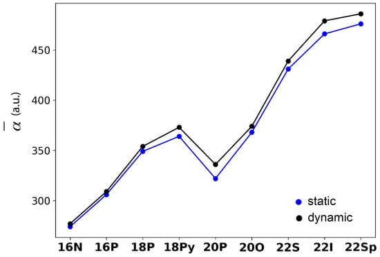 From Table 7, it is clear that polarizability increases with the macrocycle size, so the polarizability of pentapyrrolic macrocycles is larger than that of tetrapyrrolic compounds. Regarding the average polarizability (Figure 11), the following sequence is found: 22Sp > 22I > 22S > 20O > 18Py > 18P > 20P > 16P > 16N. Therefore, beside the effect of the macrocycle size, polarizability increases with aromaticity, in such a way that aromatic systems are characterized by larger average polarizability and anisotropy in both static and dynamic regime than antiaromatic homologues with a similar ring size. In all cases, solvation significantly enhances both the isotropic and anisotropic polarizability.