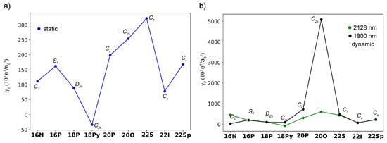 Evolution of the longitudinal component of the second hyperpolarizability (γ//) in static (a) and dynamic regime (1900 nm and 2128 nm) (b). The symmetry point group for each system is also shown.