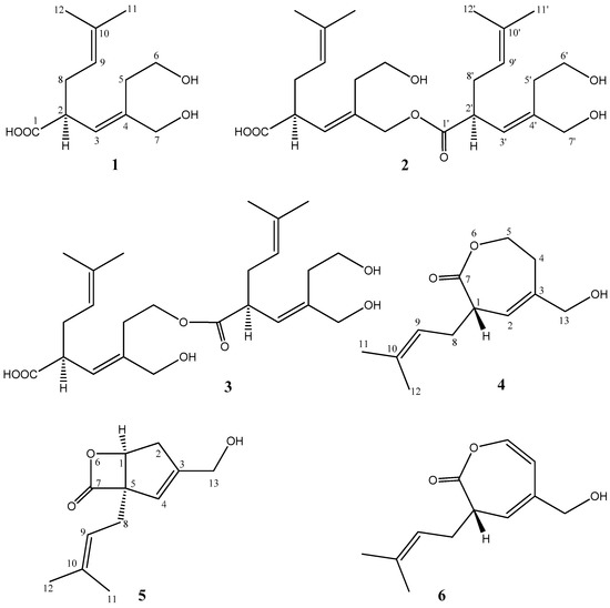 Our ongoing search for seeds of antitumor chemotherapy agents from marine microorganisms has led to the isolation of several antitumor and/or cytotoxic compounds [1,2,3,4,5,6,7,8]. In particular, we focused on the bioactive compounds with small molecular weight due to their advantages, such as easy synthesis and modification for increasing the activity. In addition, the synthesis of small bioactive compounds establishes a hypothetical biosynthesis mechanism of larger bioactive compounds. In this study, we isolated four new carboxylic acids with two primary alcohols, designated as sterepinic acids A–C (1–3) and dihydro-1,5-secovibralactone (4), together with the known vibralactone A (5) and 1,5-secovibralactone (6), from a strain of Stereum sp. OUPS-124D-1 derived from the marine alga Undaria pinnatifida. 5 was reported by Liu et al. [9], and many studies then followed this work, isolating the derivatives of 5 including 6 [10,11,12,13,14,15]. We report the determination of the absolute configurations of 1–4 by applying the phenylglycine methyl ester (PGME) method [16]. In addition, we report on the investigation of the cytotoxicity of these compounds against several cancer cell lines.