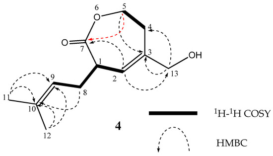 Dihydro-1,5-secovibralactone (4) exhibited the molecular formula C12H20O4, containing two fewer hydrogen atoms, and one less oxygen atom than 1. Compared with the NMR spectra of 4 (Table 2 and Table S4), those of 1 showed large differences in the proton signals of H-1 (δH 3.68 m) and H-5 (δH 4.68 ddd and 4.33 ddd), corresponding to H-2 and H-6 in 1, respectively, and the carbon signals of C-1 (δH 40.2), C-2 (δH 121.2), and C-7 (δH 174.3), corresponding to C-2, C-3, and C-1, respectively, in 1. The numbering of the carbon positions followed the numbering mentioned in a previous report [6]. 4 was observed to be the monomer with the same carboxylic acid unit as 1. In addition, HMBC correlations from H-5 to C-7 (Table S4 and Figure 4) elucidated the planar structure of 4 as a dihydro-isomer of 1,5-secovibralactone (6) [10].