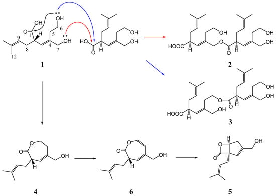 Next, for the elucidation of the stereochemistry of 2–4, we attempted to perform hydrolysis to derive 1 from 2–4; however, due to the small volume of reaction, the carboxylic acid was not produced. We therefore tried methanolysis to facilitate the purification of the product resulting from the reaction. The treatment with concd H2SO4 of MeOH solution of 2 only gave a methyl carboxylate, the spectral data (1H NMR spectrum and the optical rotation) for which were identical to those of the methyl ester of 1; i.e., 2 is found to be in the 2S, 2′S absolute configuration. The same procedure applied to 3 and 4 revealed the S configuration at C-2 and C-2′ in 3, and the S configuration at C-2 in 4, respectively. This evidence confirmed that 2–4 were composed of 1. A lone pair on the alcohol oxygen atom attacks a carboxy carbon atom by an intra- or intermolecular nucleophilic reaction, as shown by the arrows coded using three different colors (Scheme 1). The routes shown in red and blue, which are the dimerization routes, produce 2 and 3, respectively. On the other hand, the route shown in black leads to 4 followed by a dehydrogenation to 6. Meanwhile, Zhao et al., performed an in vitro enzymatic conversion, and verified biochemically the enzymatic production of 5 from 6 by the analyses of LC/MS/MS [17].