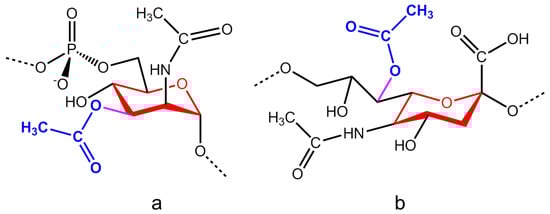 O-acetylation patterns at the ‘glycerol chain’ of the Neu5Ac residue, present at the terminal end of the branch, were also confirmed for several Group B Streptococcus (GBS) CPS serotypes (Ia, Ib, II, III, V, and VI) (Table 1), and were demonstrated to affect the inhibition of neutrophil suppression and virulence [28,29,30]. Data were consistent with an initial O-acetylation at position C7, and subsequent migration of the O-acetyl ester at positions C8 and C9. As for mammalian glycoproteins, O-acetylation of terminal sialic acid is a mechanism to prevent enzymatic de-sialylation; the exposure of terminal galactose and its excretion from the animal allow for speculation on a similar attitude of GBS.