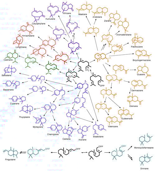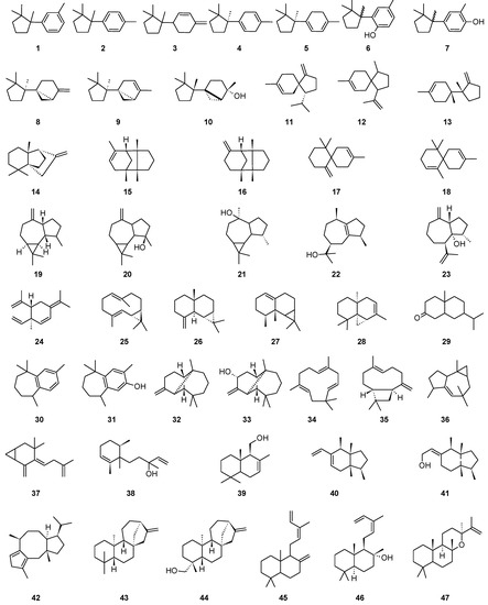 - Hong, Y.J.; Tantillo, D.J. Branching Out from the Bisabolyl Cation. Unifying Mechanistic Pathways to Barbatene, Bazzanene, Chamigrene, Chamipinene, Cumacrene, Cuprenene, Dunniene, Isobazzanene, Iso-γ-bisabolene, Isochamigrene, Laurene, Microbiotene, Sesquithujene, Sesquisabinene, Thujopsene, Trichodiene, and Widdradiene Sesquiterpenes. J. Am. Chem. Soc. 2014, 136, 2450–2463. [Google Scholar] [CrossRef] [PubMed]