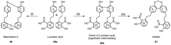 - Friederich, S.; Maier, U.H.; Deus-Neumann, B.; Asakawa, Y.; Zenk, M.H. Biosynthesis of cyclic bis (bibenzyls) in Marchantia polymorpha. Phytochemistry 1999, 50, 589–598. [Google Scholar] [CrossRef]