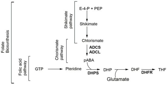 In order to better understand their mechanism of action, it would be useful to first apprehend their molecular target. In a secondary metabolism leading to folates, pABA is synthesized within the chorismate pathway from chorismate in two steps requiring regio-specific amination and aromatization sequences, with overall retention of position and stereochemistry. Chorismate and glutamine are thus aminated by ADCS, yielding glutamate and 4-amino-4-deoxychorismate (ADC). ADC is then aromatized by 4-amino-4-deoxychorismate lyase (ADCL) to generate pABA, with loss of pyruvate (Figure 5). pABA then enters the folic acid pathway, and is added to the pterin moiety by DHPS to later yield active tetrahydrofolates (Figure 1) []. The formation of the intermediate ADC in the chorismate pathway requires both a glutamine amidotransferase (GAT) and ADC synthase activity (Figure 5). In many bacteria, such as Escherichia coli and Bacillus subtilis, ADC synthesis requires two separate enzymes to perform the corresponding enzymatic GAT and ADCS activities. Most prokaryotes possess, therefore, three separate genes encoding the three different enzymatic functions needed for pABA synthesis: PabA-encoded GAT, PabB-encoded ADCS, and PabC-encoded ADCL activities (Figure 5) [,,,], whereas plants and lower eukaryotes possess two genes encoding two separate enzymes: a bifunctional glutamine amidotransferase–aminodeoxychorismate synthase (GAT–ADCS) enzyme and an ADCL enzyme [,,,,,].